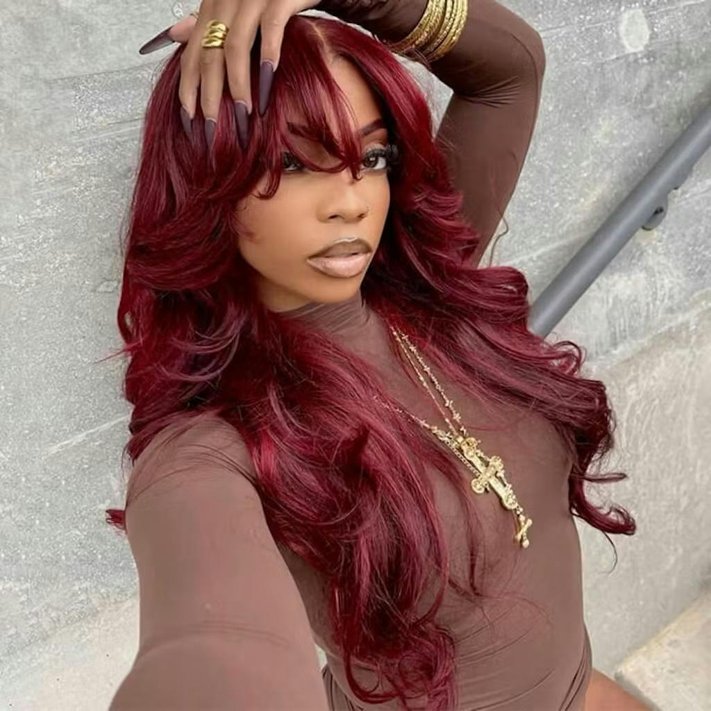 99J Burgundy Curtain Bangs Body Wave Human Hair Glueless HD Lace Wigs