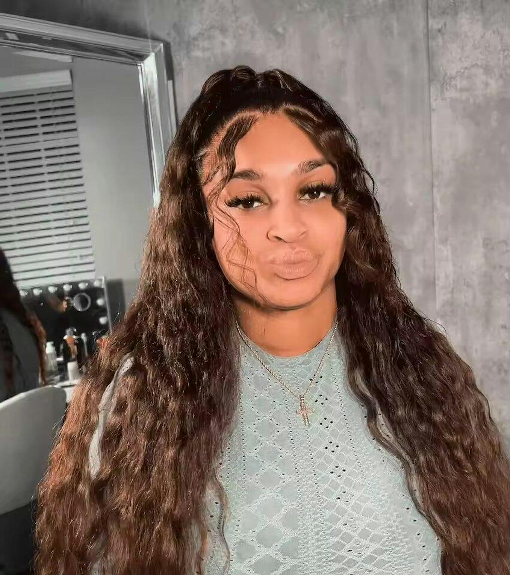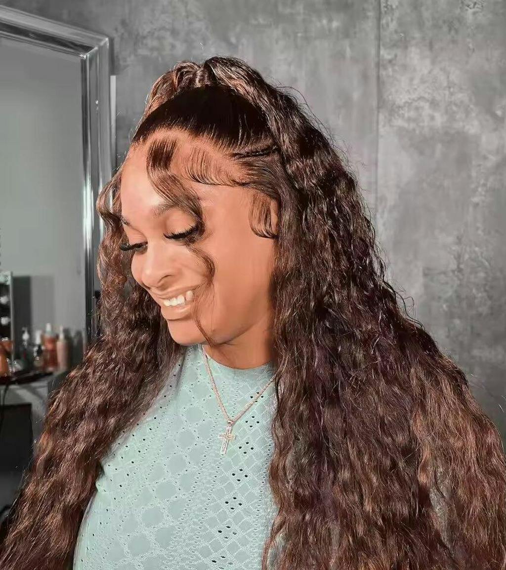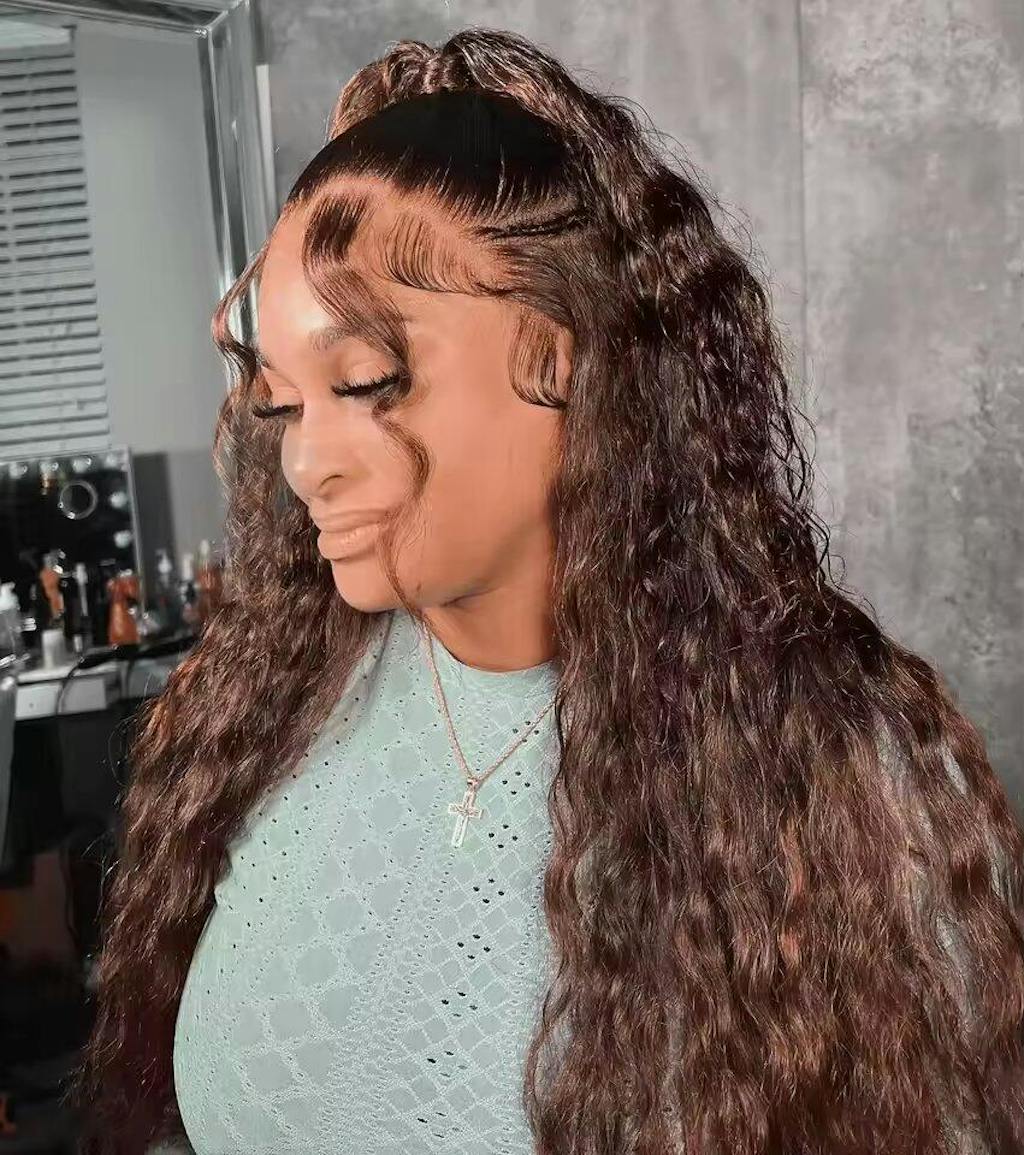 Chocolate Brown Water Wave 4B 4C Hairline Kinky Edges Human Hair Wigs Glueless Put On Go Wig